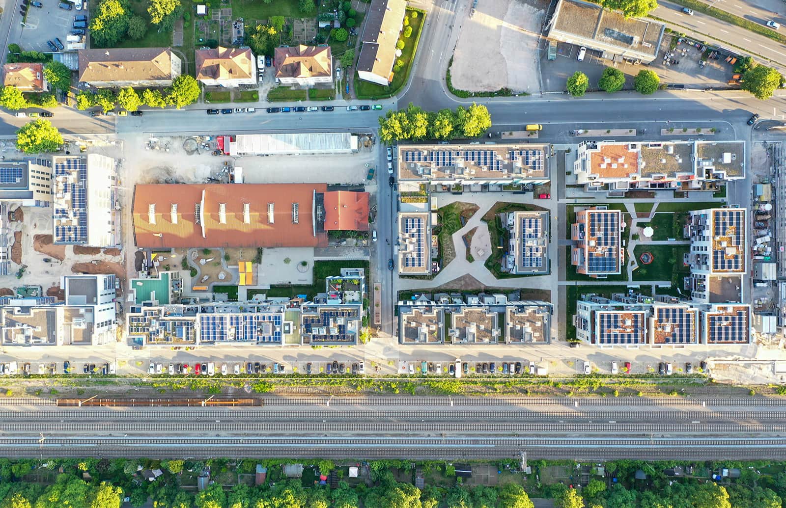 Innenhof an der alten Güterhalle mit Gemeinschaftsfläche, Privatgärten und den Freianlagen der Kindertagesstätte.