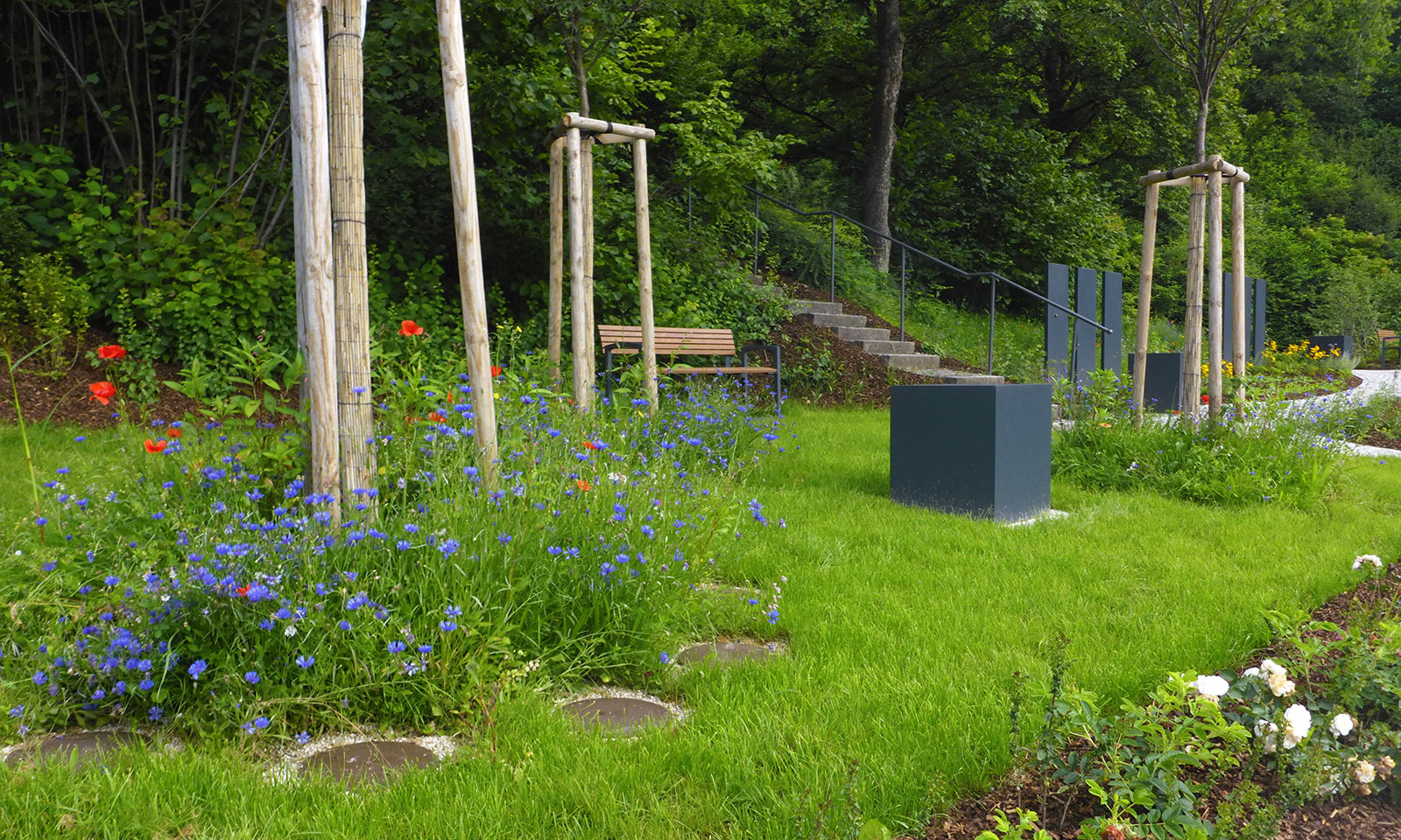 Am steilen Gelände wurden auf engem Raum ein Baumfeld sowie eine Urnen-Gemeinschaftsanlage neu angelegt. Ablegewürfel für Blüten und Beisetzung sowie Namens-Stelen aus Stahl prägen die Gestaltung, die gemischten Stauden-Gehölzflächen sowie die Blumenwiese sind zu jeder Jahreszeit ein Blickfang. Im Herbst leuchten die Kirschbäume weit sichtbar über das Tal.