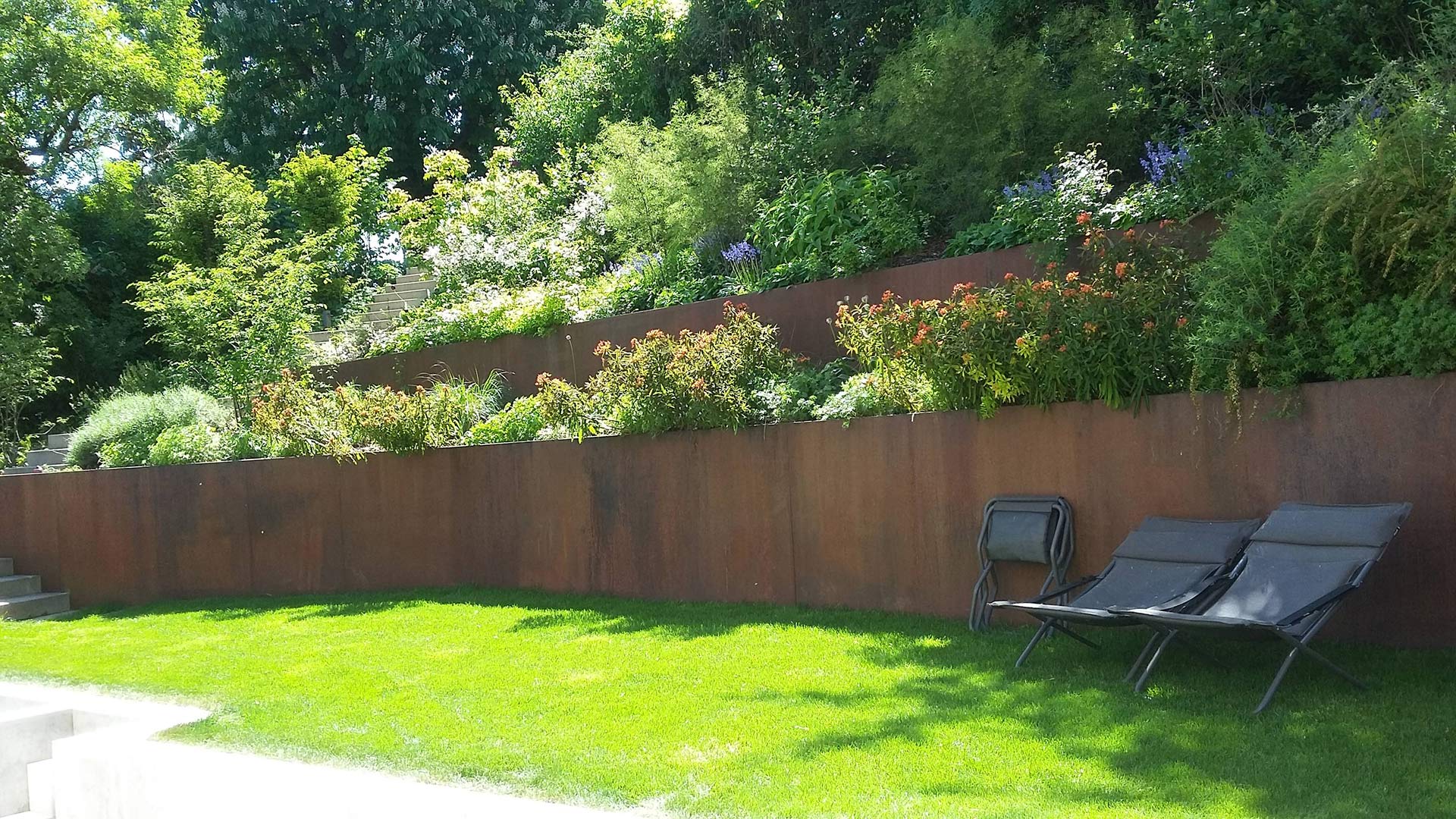 Ausführung: Die Planung erfolgte in enger Abstimmung mit Hochbau, Geologe und Statiker. An der Grenze musste eine Ortbetonmauer erstellt werden. Die unteren Mauern bestehen aus Muschelkalk, die Beton-Winkelstützmauern erhielten eine Verkleidung aus Corten-Stahl. Alle Beläge sind durchlässig oder entwässern auf dem Grundstück.